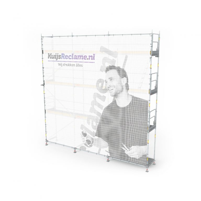Het steigerdoek wordt gemaakt van een Mehsdoek. Doordat het materiaal transparant is, kun je vanaf de steiger of vanuit het gebouw naar buiten kijken. De maximale printbreedte is 492 cm. Het steigerdoek wordt voorzien van zomen en ringen om de 30 cm, indien gewenst. Doeken groter dan 5×5 meter worden aan elkaar gezet en opgevouwen verstuurd, dus houd je niet in qua formaat.